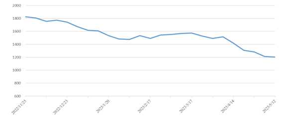 市場持續(xù)下行(2023年5月06日至5月12日)中國內(nèi)貿(mào)集裝箱運(yùn)價指數(shù)環(huán)比同比持續(xù)下跌。